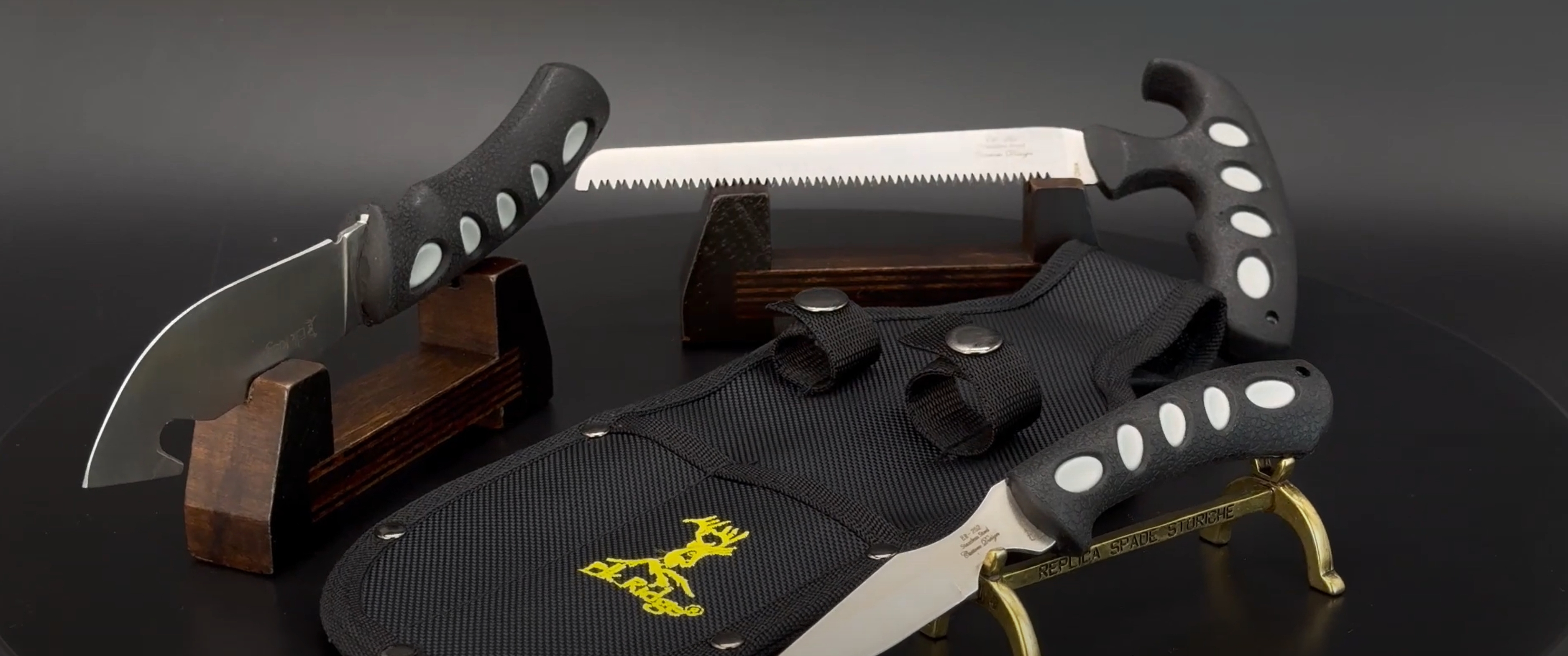 Klasyczne i bardzo praktyczne czarne i szare rękojeści z nylonu. Cały zestaw bezpiecznie można przechowywać w nylonowej kaburze Combo odpornej na warunki atmosferyczne.